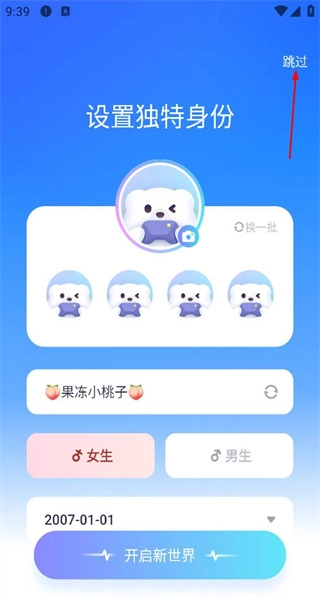打开软件后,进入独特身份设置界面,这里会呈现头像、昵称等相关设置选项,点击右上角的“跳过”按钮,即可进入软件的主界面。