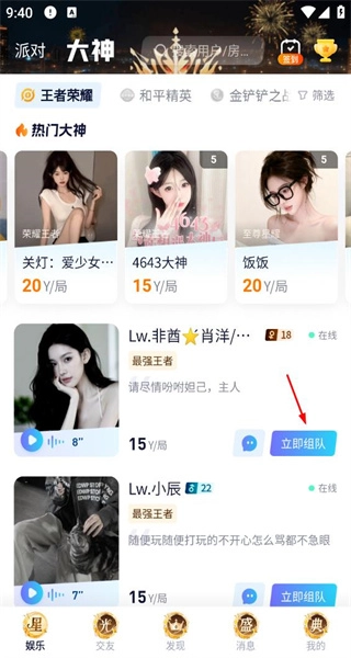 在主界面找到王者荣耀的分类选项并点击进入,接着浏览页面上的热门大神榜单,从中挑选出你觉得合适的大神,然后点击该大神对应的“立即组队”按钮,这样就能向对方发起游戏组队的邀请了。