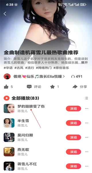 进入蒋雪儿最热歌曲推荐歌单的详情页面,你可以查看《梦的翅膀受了伤》这类歌曲,还能浏览这个歌单里的音乐作品。