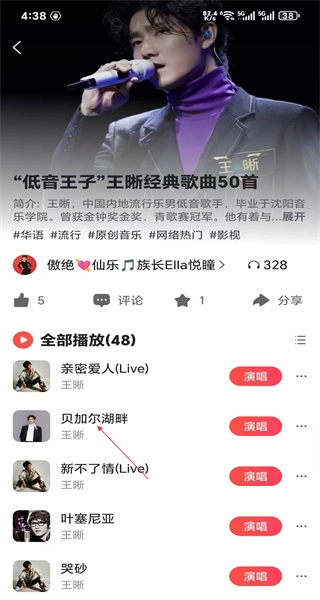 在王晰经典歌曲歌单的详情页面,你可以查看包含《贝加尔湖畔》在内的歌曲列表,进而浏览这个歌单里的歌曲内容。