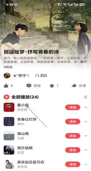 切换至民谣歌单“民谣绘梦·抒写青春的诗”的详情页面,浏览董小姐等民谣作品,查看该歌单包含的具体曲目。