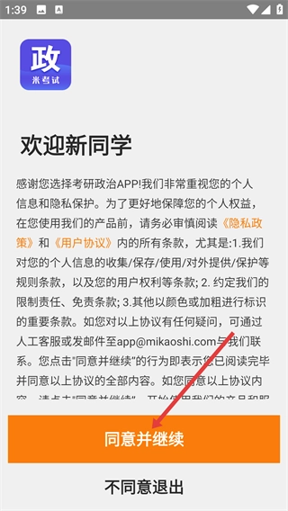 在使用考研政治相关服务前,请务必仔细阅读【隐私政策】与【用户协议】。若您同意其中所有条款,请点击【同意并继续】按钮,以进入后续操作环节。