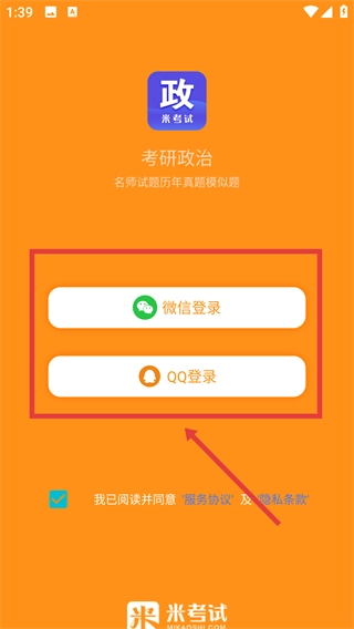 在考研政治登录界面,勾选同意【服务协议】和【隐私条款】后,可选择【微信登录】或【QQ登录】的方式进入并使用相关功能。