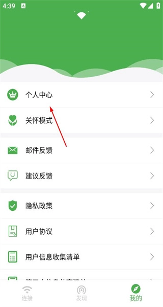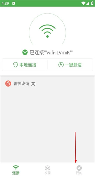 打开软件后,进入主界面,这里会显示已连接的WiFi信息,接着点击右下角的“我的”选项,就能进入个人功能页面了。