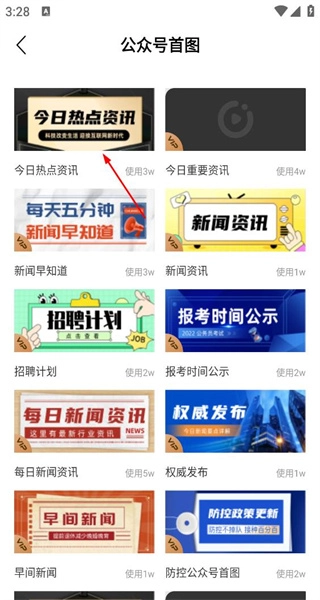 进入公众号首图模板界面后,系统会呈现多款资讯类模板,从中挑选“今日热点资讯”模板,即可着手准备首图的制作工作。