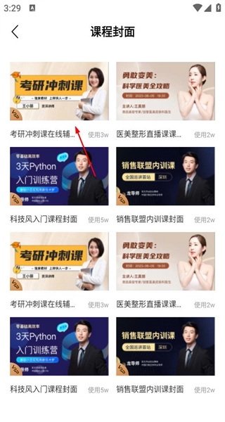 切换到课程封面模板界面,这里会展示多款课程模板供选择,从中挑选考研冲刺课在线辅导模板后,即可开展封面制作工作。