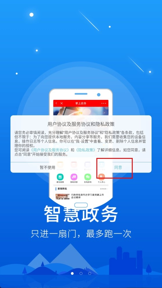 在用户协议、服务协议与隐私政策的界面中,点击【同意】按钮,即可进入体验环节。