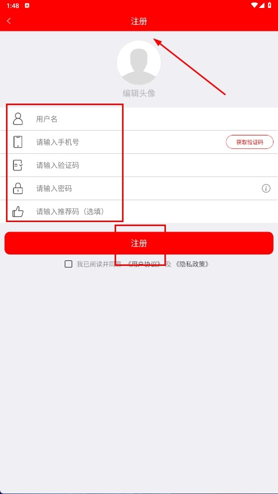 在进行注册操作时,需依次填写用户名、手机号、验证码和密码,推荐码为可选填写项,完成上述内容填写并勾选同意相关协议后,点击【注册】按钮即可完成整个注册流程。