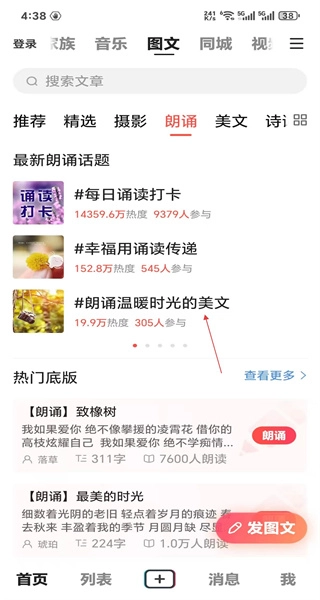 点击朗诵分类后,你能看到每日诵读打卡、幸福用诵读传递等话题,还有热门底版的朗诵内容展示。