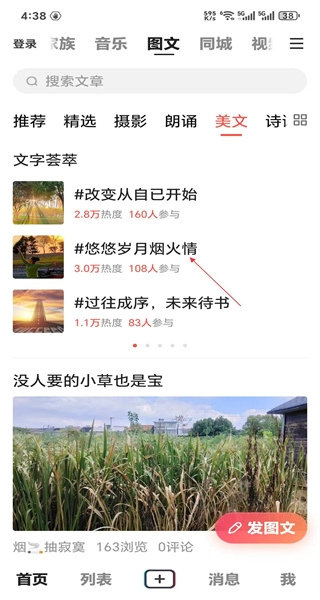 点击美文分类,能看到“改变从自己开始”“悠悠岁月烟火情”等话题,同时也会呈现文字荟萃类的美文内容。