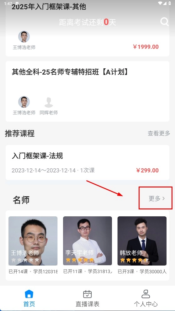 你可以在首页的“名师”板块中找到【更多】按钮,点击它就能进入名师列表页面,从而查看所有的师资信息。