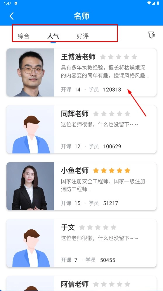 在名师列表页面,能通过【综合】【人气】【好评】这些标签进行筛选,点击相应的老师卡片,就能知晓该老师的执教经验以及学员的相关情况。