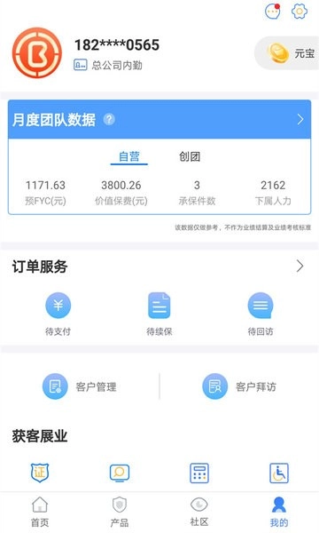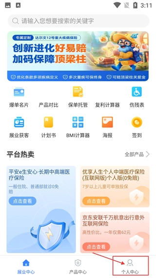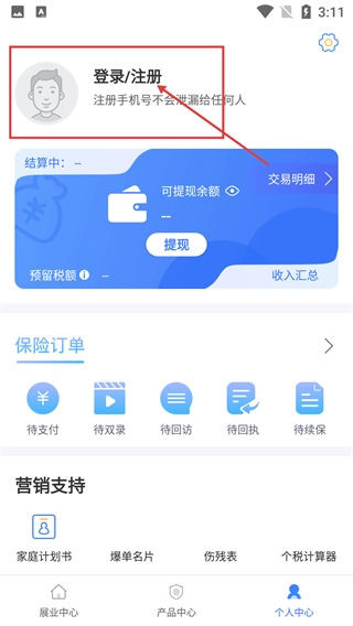 在展业中心页面,点击底部的【个人中心】选项,就能进入个人中心界面,这里包含订单管理、收入结算等功能,同时页面也提供保险产品查询等服务。