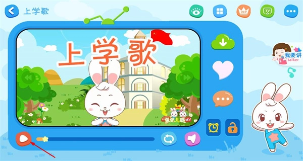 在《上学歌》的播放界面里,点击左下角的播放按钮就能启动这首儿歌的播放,此时界面会呈现出儿歌的画面以及相关的操作控件。