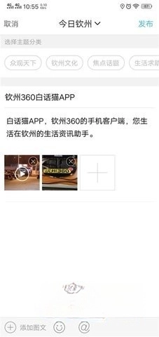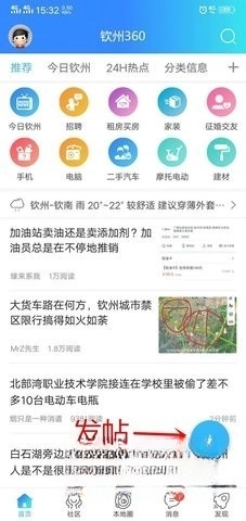 首先进入首页,查看钦州的最新资讯。若要发帖、发布视频或进行爆料,只需点击右下角的蓝色圆圈即可。