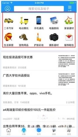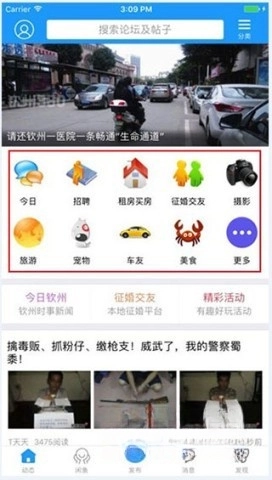 进入主页后,你会看到招聘、租房、征婚交友等多个不同的话题板块。