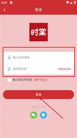 在登录页面依次输入手机号码、填写验证码,勾选用户协议后点击登录按钮,即可完成登录流程。
