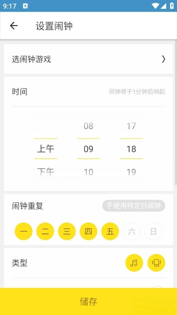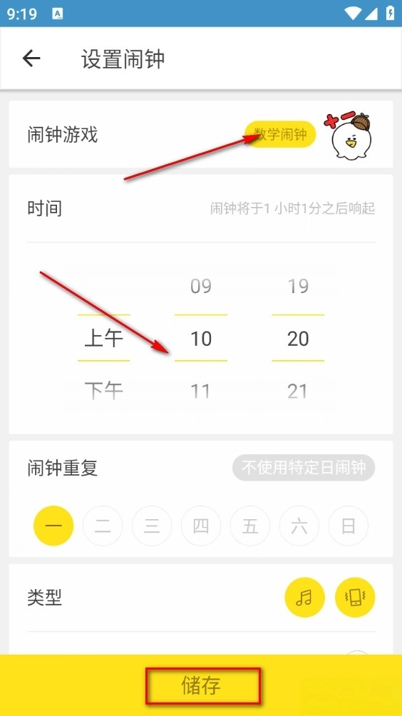 打开后挑选一个自己喜欢的闹钟游戏,接着设置闹钟时间,设置完成后点击保存