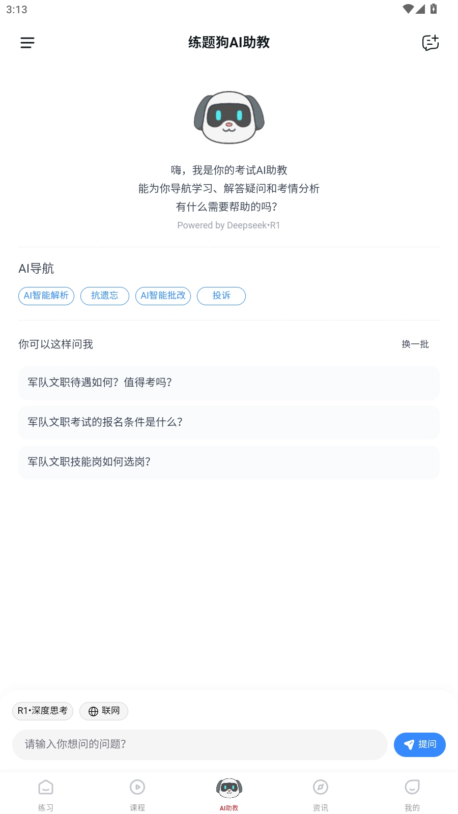 AI 助教具备解答军队文职考试相关疑问、提供专业支持的功能。