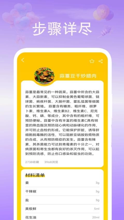 菜谱的步骤介绍十分详尽全面,用户可以通过查看这些详尽的步骤介绍来学习做菜。