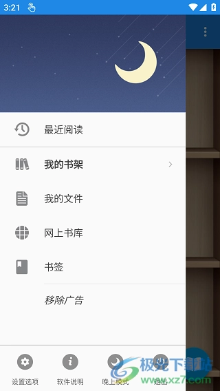 左侧的功能栏支持去广告功能,网上的书籍都能一键导入阅读。