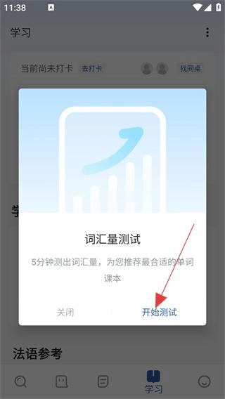 当词汇量测试的弹窗弹出后,点击【开始测试】按钮,即可启动词汇量检测流程。