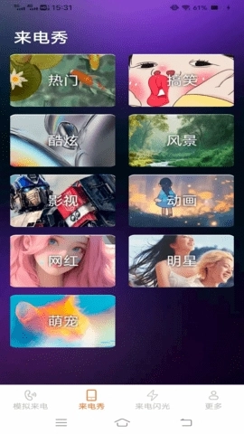 支持来电秀的分类筛选,可按照风格、热度等维度进行分类,帮助用户快速定位到自己喜欢的来电显示效果。
