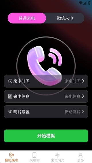 提供不同的模拟来电功能,涵盖普通来电与微信来电两种类型,可助你应对突发状况。