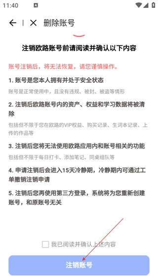 在账号删除页面,仔细阅读并确认注销相关内容后,点击【注销账号】按钮,即可完成账号的注销操作。