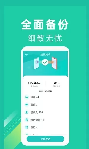 4、【一键换机】只需一键,轻松换机。它支持通讯录、软件、短信、文件、通话记录、书签、图片、音乐、视频、日程等众多数据的传输。