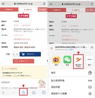 3、如果您使用的是iOS端时。当使用分类导航检索心仪网站时,会跳转至端默认浏览器Safari,您可在Safari中浏览商品。在您想购买的商品的详情页面中,点击“分享”按钮,在更多中打开“魔法集市Global"。点击“魔法集市Global"后,页面将自动跳转回Masadora的端,并为您自动解析该网页。