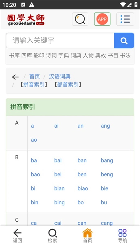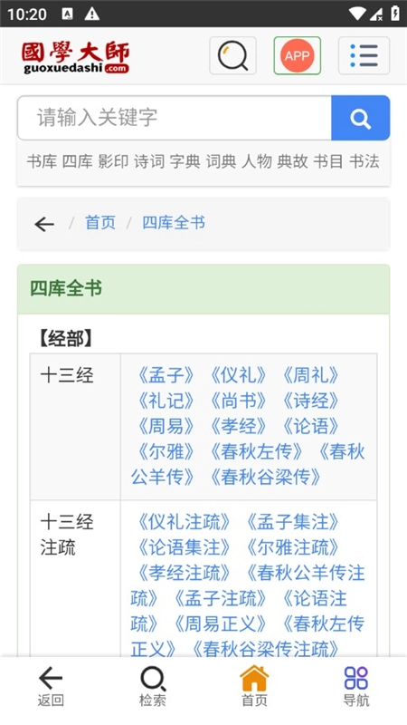 国学大师网手机版收录了四库全书、古今图书集成、说文解字诂林、汉语大字典、现代汉语词典、康熙字典等海量经典文学典籍,资源十分丰富,有需求的用户可免费使用!