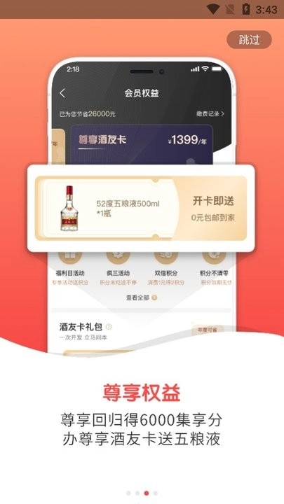 ·尊享专属权益,回归即享6000集享分,办理尊享酒友卡即赠五粮液;