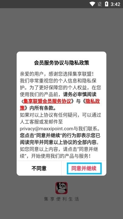 在本站安卓网启动软件后,仔细阅读弹出的会员服务协议和隐私政策,随后点击【同意并继续】按钮。