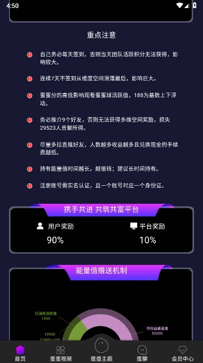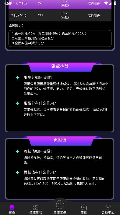 通过贡献能够获取与蛋蛋能量不一样的全新收益。贡献值的获取比例是1:100,也就是说,积累100分贡献值就可以兑换1元人民币。