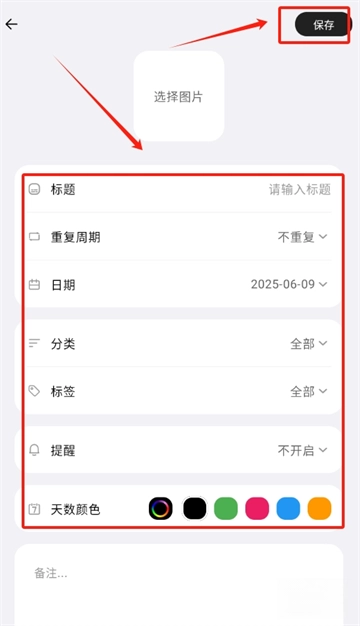 完善事件详情的步骤如下:先填写标题,接着设置重复周期,然后选择日期,再添加分类标签,之后配置提醒通知,最后点击保存按钮,即可完成记录。