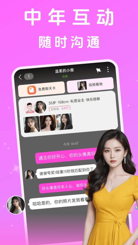 中年夜遇是一款功能多样、免费互动的高品质交友软件,它能精准契合广大用户的社交需求,实时为用户推荐合适的交友对象。用户可以一键查看平台推荐的好友资料卡片,快速了解对方情况;平台还提供多元化的聊天模式,所有聊天都能直接开启,完全不必担心信息延迟的问题。此外,用户还能为每个好友自定义专属昵称,便于清晰区分不同联系人。