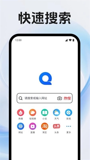 多元资源搜索入口:整合影视、短视频、小说、直播、淘宝等多种类型资源的搜索通道,用户可直接选择对应类别开展精准搜索,例如搜索“免费小说”“实时公交车”这类内容;同时具备网址导航功能,收录了常用网站入口,能让用户快速访问头条、影视平台等,有效减少操作步骤。