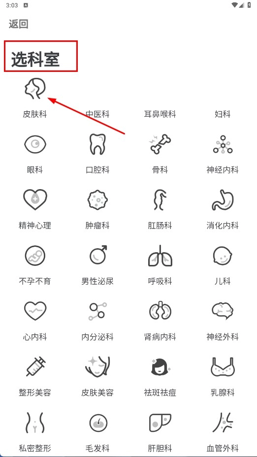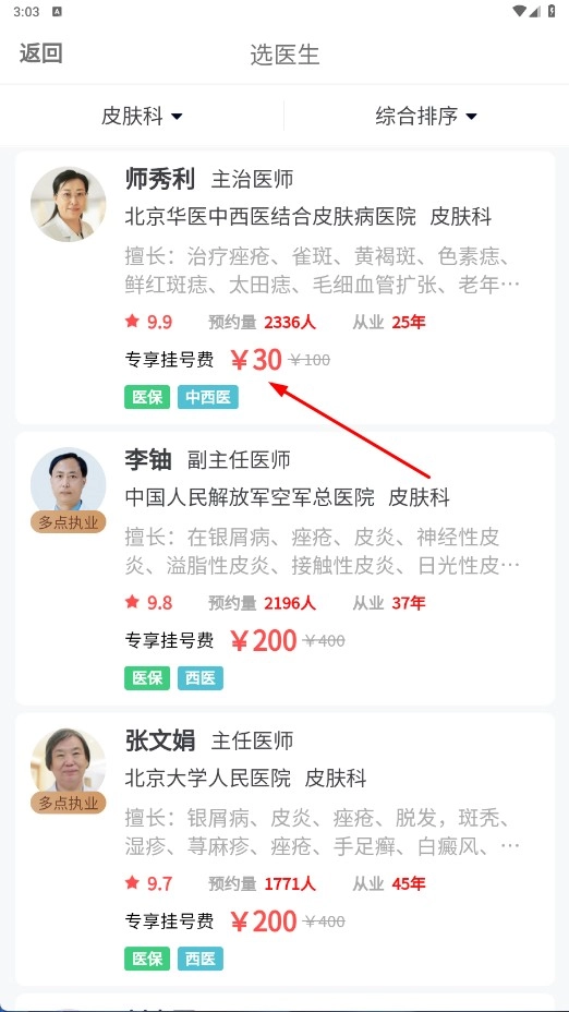 在选择科室的页面中,挑选像【皮肤科-科室选项】这类选项后,即可进入选择医生的页面。