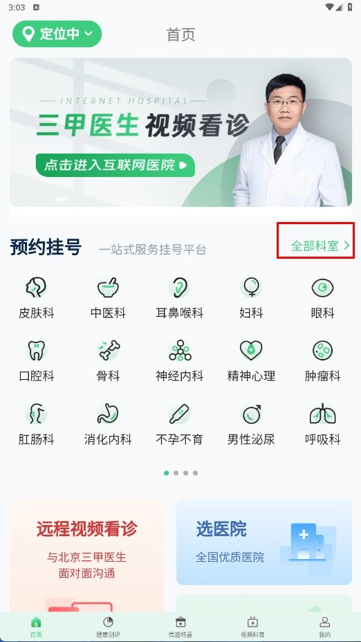在首页的预约挂号区域,点击【全部科室】功能按钮,即可进入科室选择页面。
