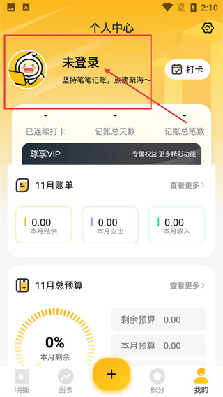 在个人中心页面,点击标有【未登录】的区域,即可跳转至登录注册界面。