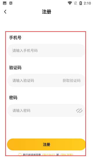 在注册页面,先输入【手机号】,接着获取并填写【验证码】,再设置【密码】,最后点击【注册】按钮就能完成注册流程。