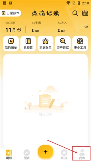在【点滴记账】的主界面里,找到右下角的【我的】按钮并点击,就能进入个人中心的入口。