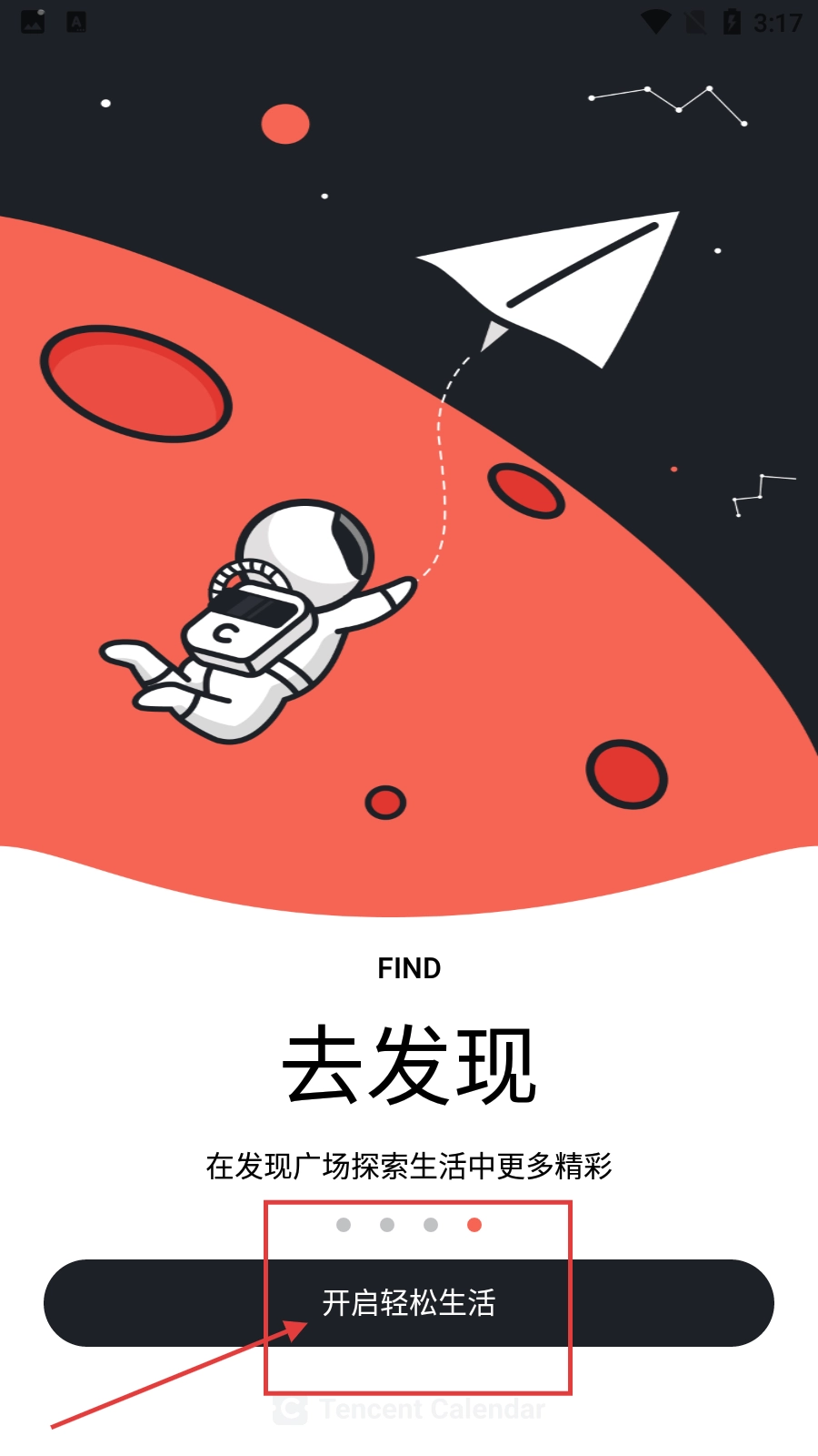 打开【腾讯日历】后,在“去发现”页面中,点击【开启轻松生活】按钮。