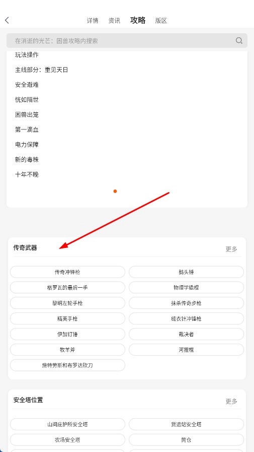 进入游戏攻略详情页面后,就能查看玩法操作、传奇武器等相关攻略内容,比如《消逝的光芒》的攻略。