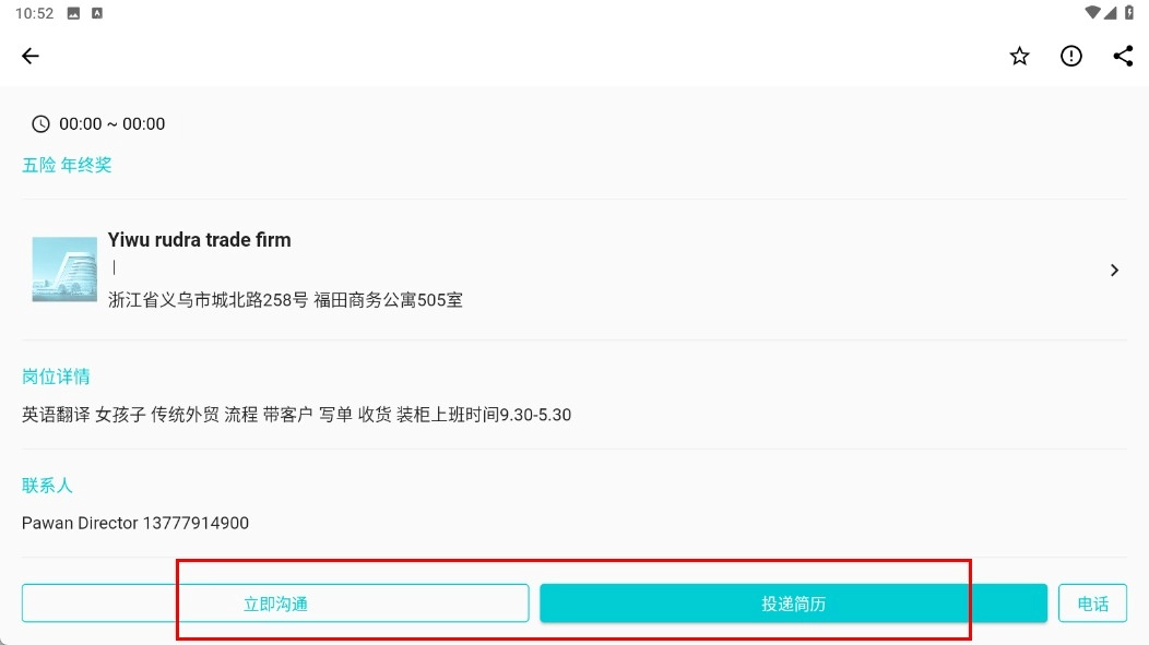 进入岗位详情页面后,你可以选择点击【立即沟通】按钮,或者通过【投递简历】功能按钮来完成求职相关的操作。