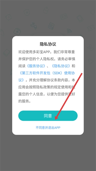 在使用多彩宝之前,您需要仔细阅读《服务协议》《隐私协议》以及《第三方软件开发包(SDK)使用协议》,并点击【同意】按钮,这样才能继续使用多彩宝。