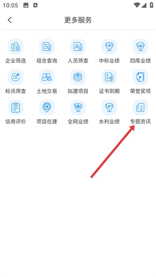 在更多服务页面,点击【专题资讯】选项,进入专题资讯列表页面。