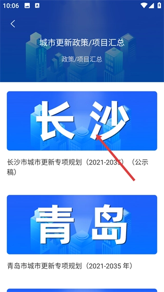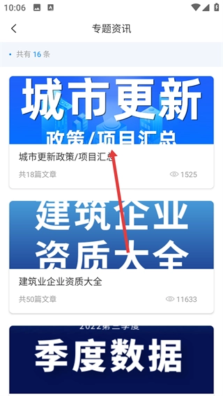 在专题资讯列表页面,挑选你感兴趣的专题(例如【城市更新政策/项目汇总】),然后进入该专题的详情页面。