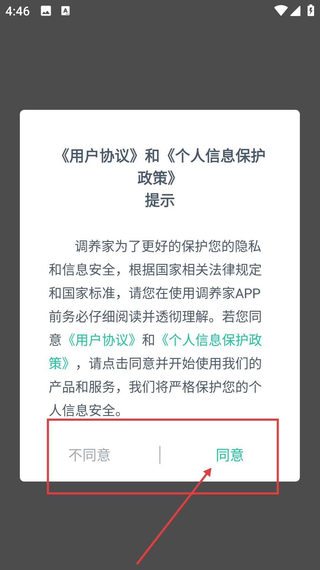 在启动应用时,系统会弹出《用户协议》与《个人信息保护政策》的提示页面,点击【同意】按钮后,即可进入应用主界面。